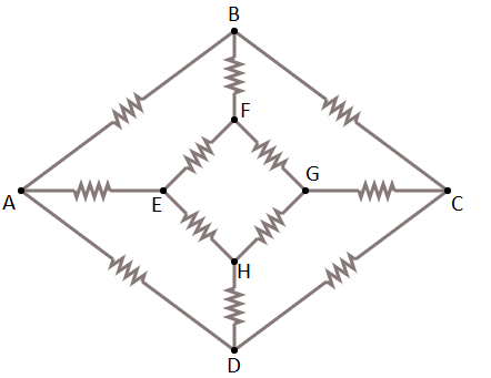 Step 1: Here if we connected the battery between $A{{ \& C}}$ , then there is no current flow between the resistances between $B{{ \& F}}$ and between the $H{{ \& D}}$ . It is because the current is treated as a balanced wheatstone bridge.