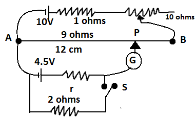 Here, ${I_{AP}} = 1A$, $\rho = \dfrac{9}{{12}}\Omega {m^{ - 1}}$ and l=length of AP or balanced length of the potentiometer.