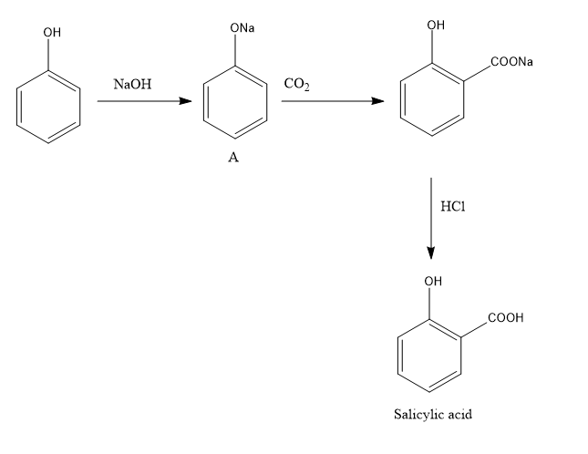 First, we will understand what Kolbe’s reaction is. Kolbe's reaction is the conversion of phenol into salicylic acid. In the first step, phenol is converted into phenoxide ion by reacting it with sodium hydroxide. In the second step, the reaction of phenoxide ions with carbon dioxide gives sodium salicylate. And the reaction of sodium salicylate with HCl gives salicylic acid.