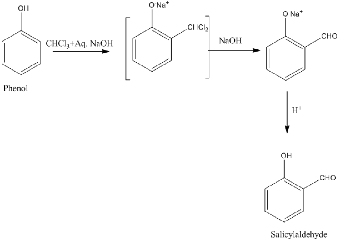 Additional Information: Let’s understand another important reaction of phenol, that is, the Riemer-Tiemann reaction. In this reaction, phenol to salicylaldehyde conversion takes place by reacting phenol with chloroform along with sodium hydroxide in the first step. In the second step, the formed intermediate again undergoes a reaction with sodium hydroxide in the acidic medium. The product formed in the reaction is salicylaldehyde.