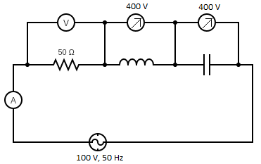 Note: The voltage across the inductor and capacitor is same, by subtracting these terms it will become zero, in equation (2), the voltage value substituted is the applied potential difference to the LCR circuit and it is mentioned in the circuit diagram. Then by substituting, the current reading shown by ammeter is determined.