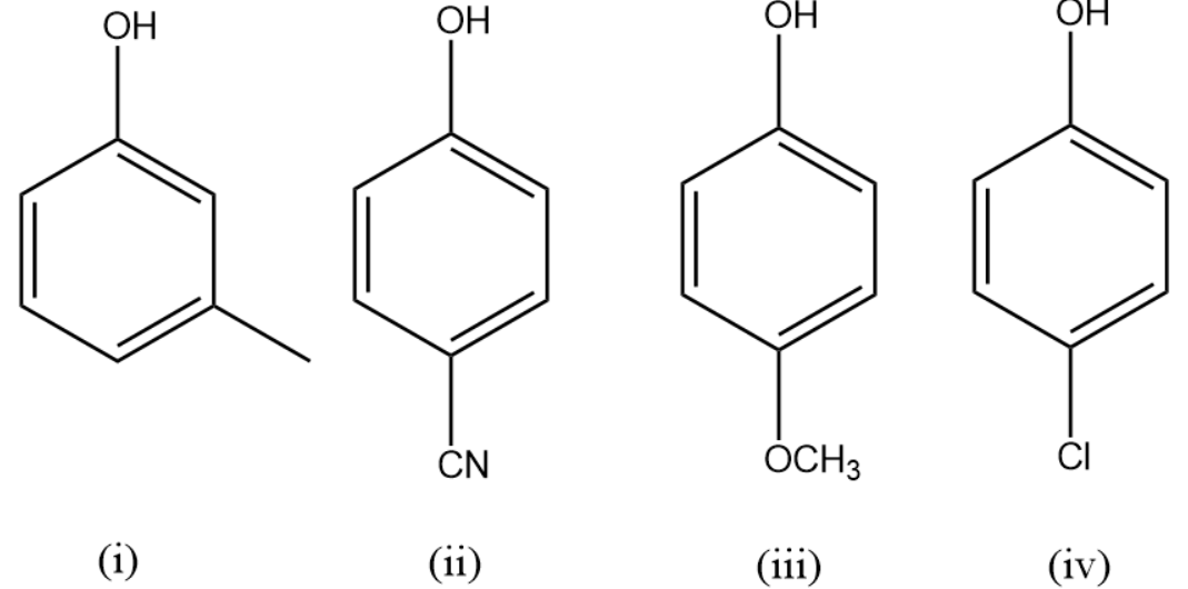 Hint: The four organic compounds have the hydroxyl group in common. The acidic strength of the compounds can be determined by the stability of the conjugate base formed. Only when the conjugate base formed is stable, the hydrogen ion will be released easily. The groups attached will contribute to either stabilizing or destabilizing the negative charge after deprotonation.