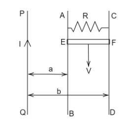 Infinite current-carrying conductor \[PQ\] . $AB$ and $CD$ are smooth conducting rods on which a conductor $EF$ moves with constant velocity $V$ as shown in the figure. The force needed to maintain a constant speed $EF$ is
