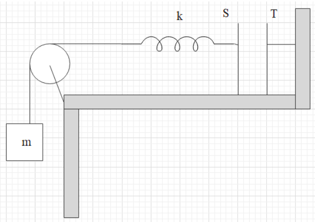 Here it is given that this is a parallel plate capacitor with plates S and T connected across a battery. After charging the battery is disconnected and now the charged plates are now connected as shown in the system. Here the plate S of the capacitor is connected with a spring of spring constant $k$ further, the spring is connected to a block of mass $m$. The area of plates has been given as $A$.