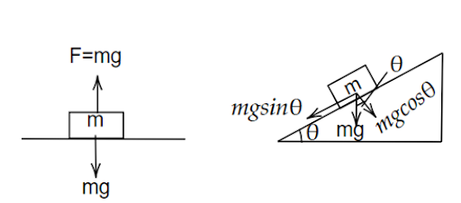 Consider an inclined plane in which a block of mass m is placed, so that, due to the weight of the block the force acts downwards as \[F = mg\] and this splits into two components \[mg\sin \theta \] along the x-axis and \[mg\cos \theta \] along the negative y-axis(downwards) and normal force acting along the upwards.