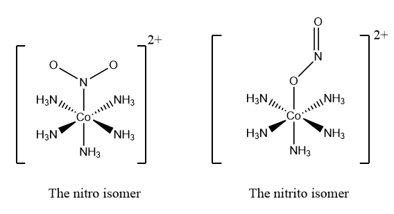 Note: It is important to note that in the linkage isomerism, the formula and composition of the complex remain the same but the properties of the complex differ from each other. Also, a change in the name of denoting the ligand is also observed (nitro and nitrito).