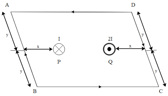 Let $\mathrm{B}_{\mathrm{P}}$ and $\mathrm{B}_{\mathrm{Q}}$ be the magnetic field produced by the wire $\mathrm{P}$ and $\mathrm{Q}$ which are placed symmetrically $\mathrm{i}$a rectangular loop ABCD as shown in figure. Current in wire $\mathrm{P}$ is directed inward and in $\mathrm{Q}$ is $2 \mathrm{I}$ directed outwards. if $\int_{\mathrm{A}}^{\mathrm{B}} \overrightarrow{\mathrm{B}} \mathrm{Q} \cdot \overrightarrow{\mathrm{d}} \ell=2 \mu_{0}$ tesla meter $, \int_{\mathrm{D}}^{\mathrm{A}} \overrightarrow{\mathrm{B}} \mathrm{p} \cdot \overrightarrow{\mathrm{d}} \ell=-2 \mu_{0}$