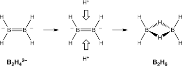 The bonding between the boron atoms and the bridging hydrogen atoms is, however, different from that in molecules such as hydrocarbons. Each boron uses two electrons in bonding to the terminal hydrogen atoms and has one valence electron remaining for additional bonding. The bridging hydrogen atoms provide one electron with each. The B2H2 ring is held together by four electrons which form two 3-centre 2-electron bonds. This type of bond is sometimes called a 'banana bond'.