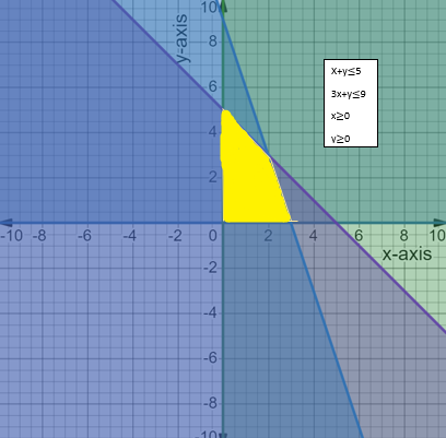Image: Graph of linear inequalities \[3x + y \leqslant 9\,\] and \[x + y \leqslant 5\,\]