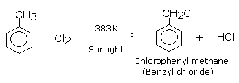 In the first step reaction,toluene reacts with chlorine in presence of sunlight at 383k to give Benzyl Chloride which is also called Chlorophenyl methane by substituting at side