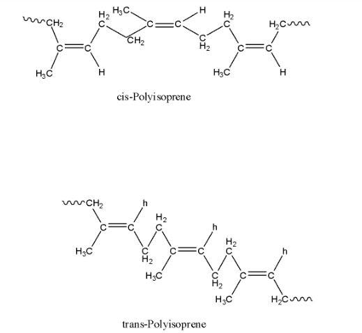 Since each repeating unit in polyisoprene contains a double bond, it may have either a cis- or a trans- orientation. Actually, in natural rubber, all the double bonds have cis- stereochemistry. In other words, natural rubber is cis-polyisoprene. In contrast, synthetic rubber (gutta percha) is trans-polyisoprene. The structure of natural rubber and gutta-percha is given below: