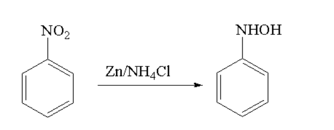 Nitrobenzene is converted to N-phenylhydroxylamine in presence of zinc dust along with ammonium chloride. It acts as a mild reducing agent which reduces the double bond oxygen present in the nitro group into an oxime. The zinc donates the electron pair to convert into a divalent cation.