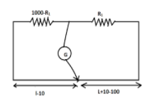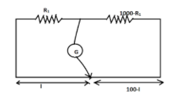 Here ${R_1}$ is the resistance on the left side of the galvanometer, ${R_2}$ is the resistance of the galvanometer, $l$ is the distance of the galvanometer from the left end and $100 - l$ is the distance of the galvanometer from the right end.