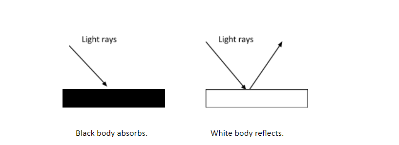 Perfect black color absorbs the radiation incident on it completely. It neither reflects or transmits any radiation. A perfect ideal black body doesn’t exist but a black object behaves in the similar manner, it absorbs the radiation more than any other color.