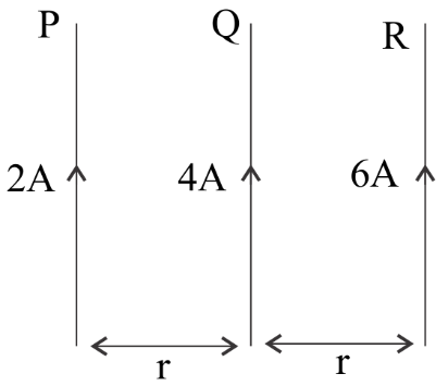 From the diagram, between the wire Q, R and P there will be a force of attraction and the resultant force will be towards the left since they carry current in the same direction and according to the Fleming left and rule.