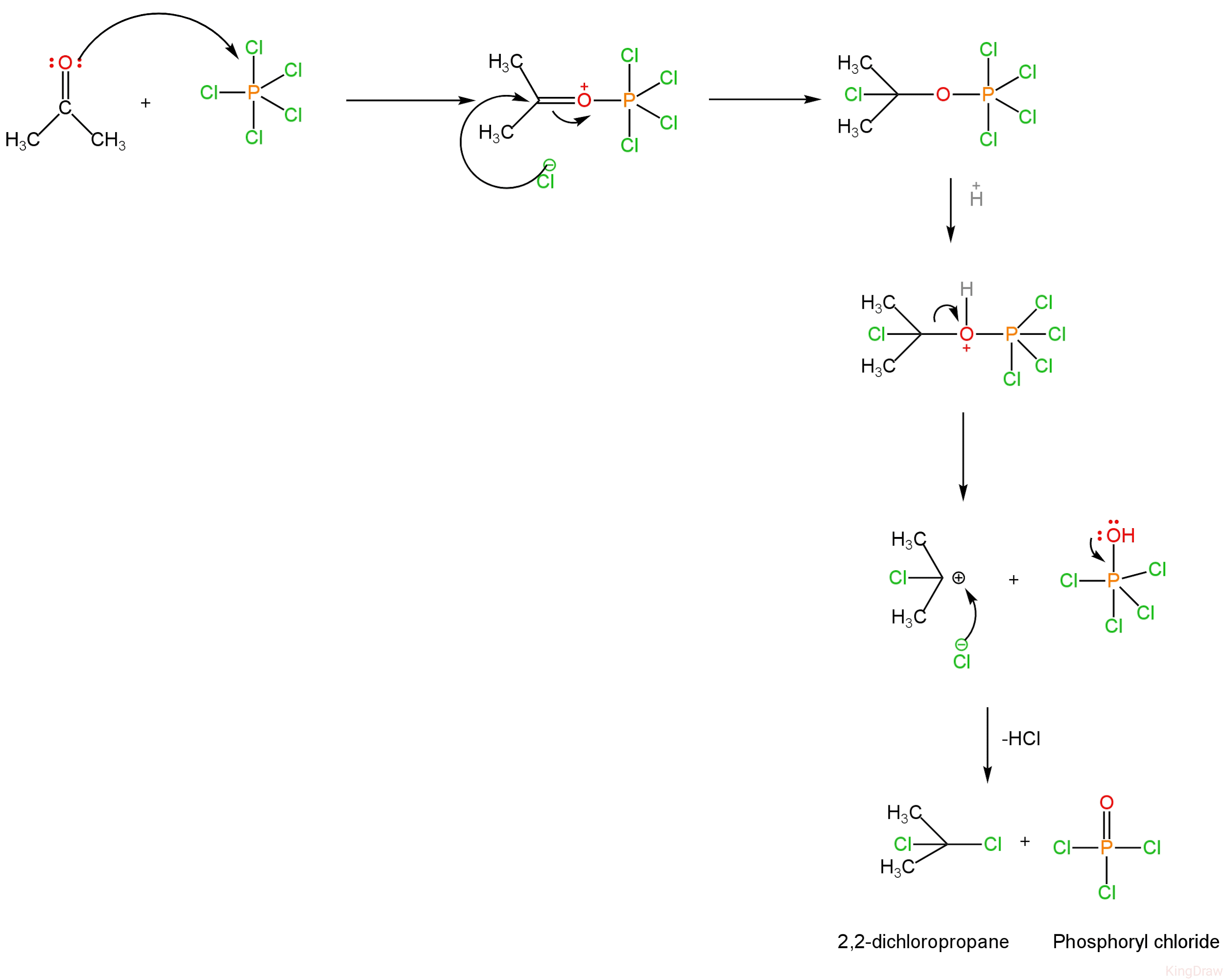 1. The lone pair of oxygen in the carbonyl group attacks the phosphorus atom present in phosphorus pentachloride leading to the formation of a complex.