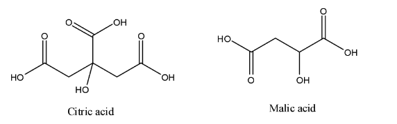 - Tomato contains more than more than 10 different types of acids. But out of them, tomatoes have two acids that occur in tomatoes at a very large percentage. These acids are citric acid and malic acid. Tomatoes also contain another essential acid like ascorbic acid, which is better known by its common name vitamin C. Structure of Citric acid and Malic acid is shown below.