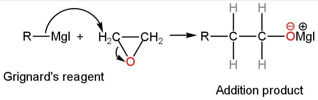 Note: It must be noted that the ease of reaction of epoxide with RMgI increases with the increase in the ionic character of the C-Mg bond. In the preparation of Grignard reagents, a solution of the alkyl halide is dipped in dry ether into the reaction flask comprising magnesium ribbon suspended in dry ether. Dry ether is utilised as moisture may react with Grignard's reagent to form alkane. Thus, moisture or impurities discourage the yield of Grignard's reagent.