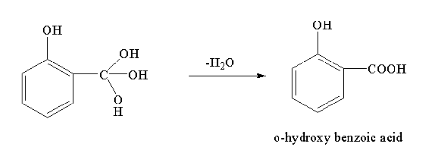 Step 4: In the fourth step, the water molecule is removed to form a stable compound with a carboxylic group forming a benzoic acid and hydroxy group at the ortho position. The compound name of o-hydroxy benzoic acid.