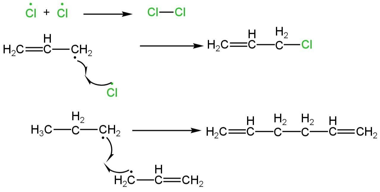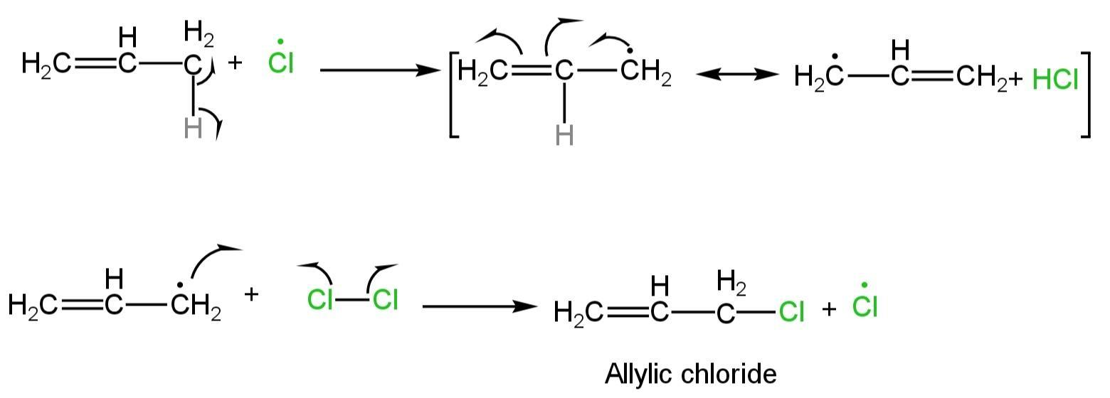 The intermediate radical then reacts with a chlorine molecule to produce the allylic chloride product which again forms the chlorine radical, which starts again the radical chain mechanism.