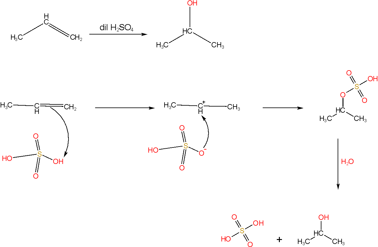 $CH_3-CH=CH_2 +\ \ dil.\ H_2SO_4\ \ \ \rightarrow CH_3-CH(OH)-CH_3$