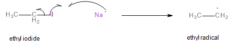 In the first step, one electron from the metallic sodium is transferred to \[{C_2}{H_5}I\] producing an ethyl radical as shown below.
