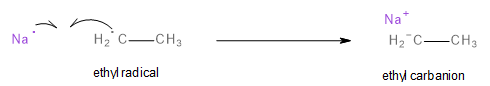 The ethyl radical then accepts an electron from another sodium atom to form an ethyl carbanion as shown here.