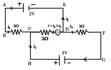 Hint: In the given question, the circuit has two loops. We can apply Kirchhoff’s law for each loop to get the unknown current, voltage or resistance values by using the values given. We need to find the reading of the ammeter in a loop, so we will use the Kirchhoff’s second (voltage) law. As we know, Kirchhoff’s voltage law states that “The voltage around a loop is equal to the sum of every voltage drop in the same loop for any closed circuit”. We will use this law and form the equations for both loops separately and then we can solve the equations to get the value of the unknown parameter.