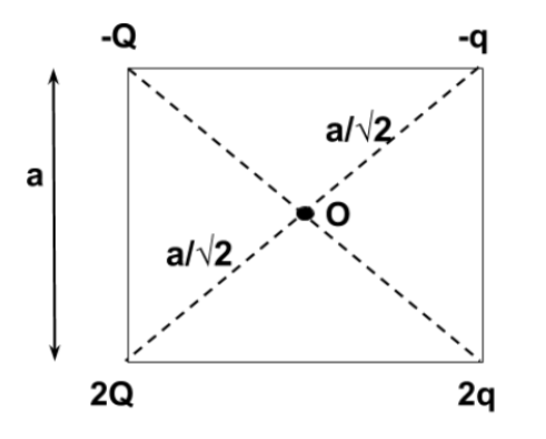 \therefore \dfrac{{K\left( { - Q} \right)}}{{\dfrac{a}{{\sqrt 2 }}}} + \dfrac{{K\left( { - q} \right)}}{{\dfrac{a}{{\sqrt 2 }}}} + \dfrac{{K\left( {2q} \right)}}{{\dfrac{a}{{\sqrt 2 }}}} + \dfrac{{K\left( {2Q} \right)}}{{\dfrac{a}{{\sqrt 2 }}}} = 0 \\