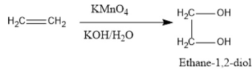 We know that the strong oxidising nature of potassium permanganate gives oxygen in an alkaline or neutral medium. The oxygen obtained has a role in the oxidation of alkene to form 1,2-diol. Therefore, the reaction of ethene with the potassium permanganate in the alkaline medium gives the product of ethylene glycol or 1,2-diol.
