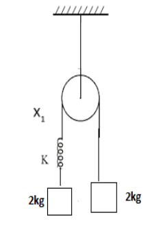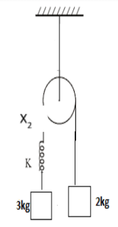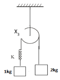 Same spring is attached with 2kg, 3kg and 1 kg blocks in three different cases as shown in figure. If x1, x2, x3 be the extension in the three cases then,
