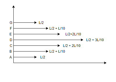$X = \dfrac{{\left\{ {2 \times \dfrac{{ML}}{2} + 2 \times M\left( {\dfrac{L}{2} + \dfrac{L}{{10}}} \right) + 2 \times M\left( {\dfrac{L}{2} + \dfrac{{2L}}{{10}}} \right) + M \times \left( {\dfrac{L}{2} + \dfrac{{3L}}{{10}}} \right)} \right\}}}{{7M}}$