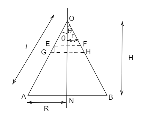 Now let’s take a differential element as shown in the dotted line. The slant of the height of the differential element is dl, radius r, and height from the apex is h. Let’s consider a triangle in the differential element as shown in the diagram.