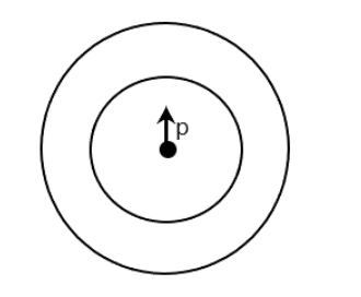 Shown in the figure is a shell made of a conductor. It has inner radius \[a\] and outer radius \[b\], and carries charge \[Q\]. At its centre is a dipole \[\vec P\] as shown, in this case: