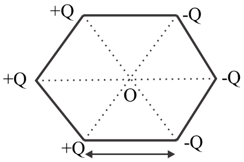 Six charges are placed at the vertices of a rectangular hexagon as shown in the figure. The electric field on the line passing through point $o$ and perpendicular to the plane of the figure as a function of distance $x$ from point o is ($x > > a$):