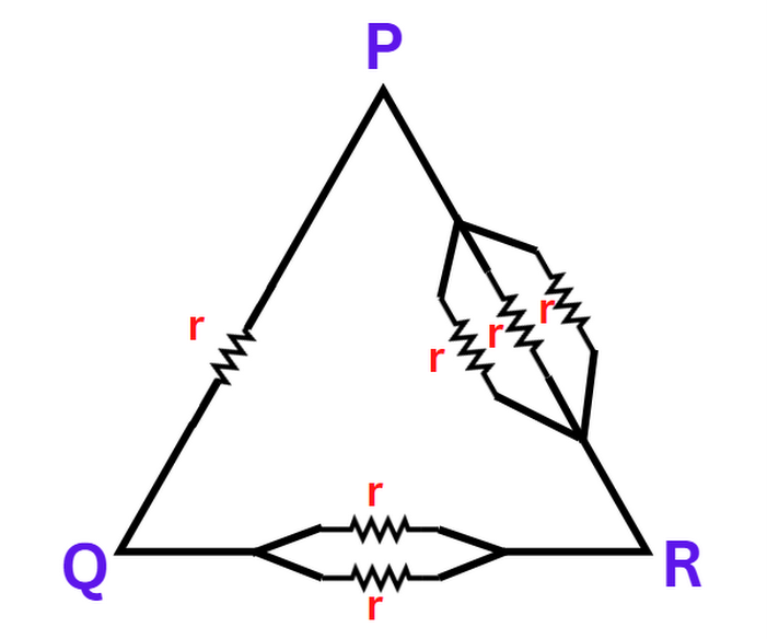 $\dfrac{1}{{{R_{PR}}}} = \dfrac{1}{r} + \dfrac{1}{r} + \dfrac{1}{r} \Rightarrow {R_{PR}} = \dfrac{3}{r}$