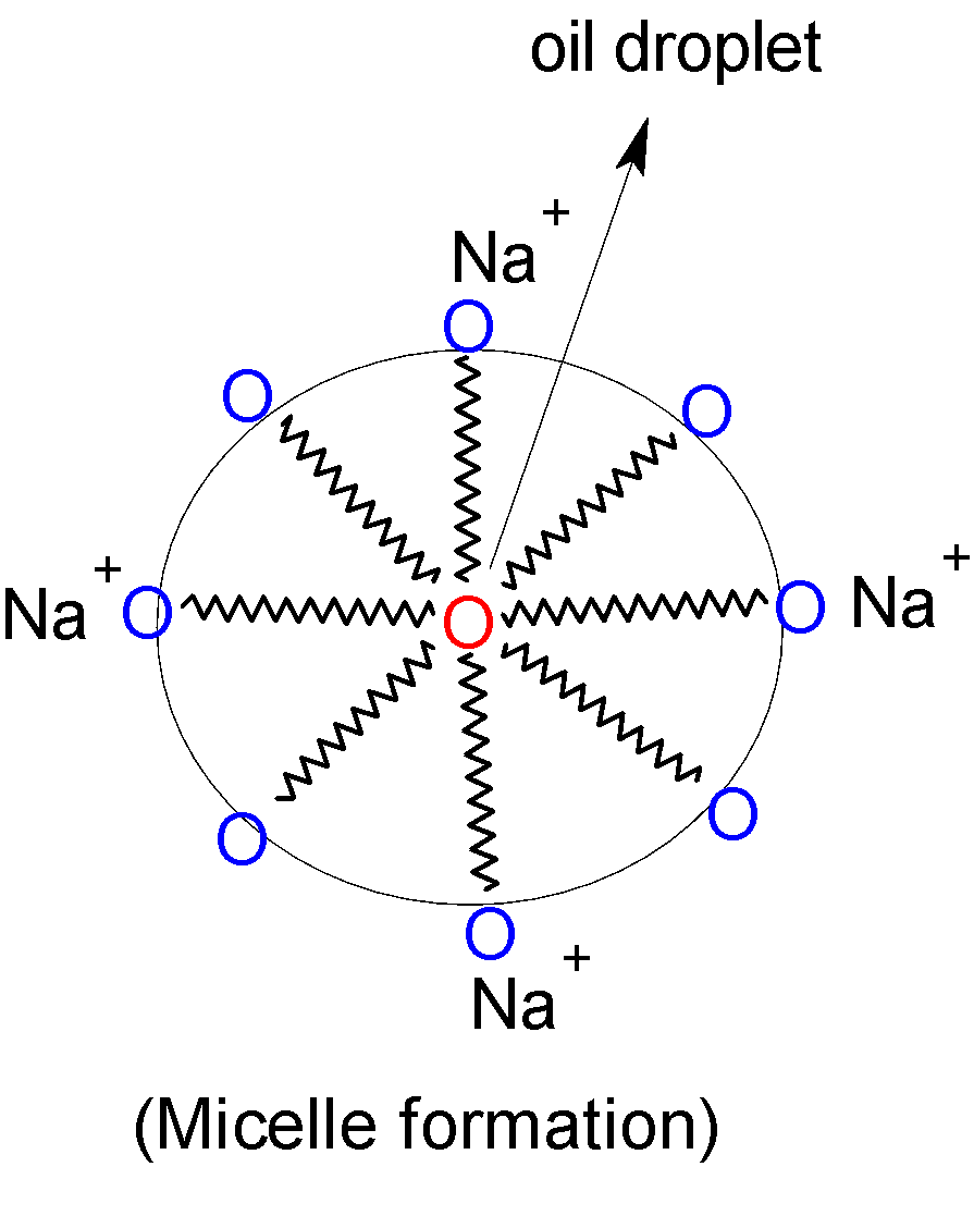 Normal water does not remove dirt from skin and clothes as dirt is oily or greasy in nature. Hence sodium or potassium salts of higher fatty acids or soaps that are water-soluble are able to remove this dirt from water. When a dirty cloth is kept in a soap solution, the long non-polar hydrocarbon tail of soap molecules directs towards the oily dirt particles whereas polar heads are directed towards the water. Therefore forms spherical micelles which are attracted to water and carry dirt particles along with them. In this way, surfactants remove dirt from clothes.