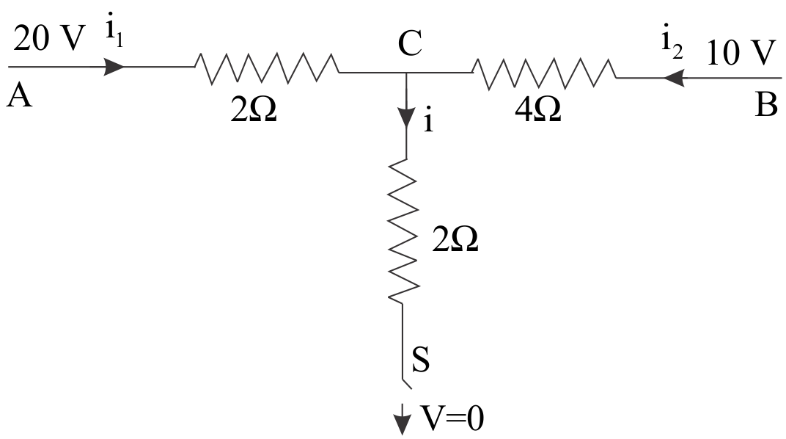 Hint: Let the potential across terminal C be \[xV\] and apply the Kirchoff’s Current Law at point C i.e. the current incoming is equal to the current outgoing . And first find the value of \[x\] and this will ultimately help us in finding the value of \[i\] .
