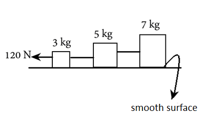 A particular amount of force is acting upon a chain of objects, the tensions in the cords are asked to be determined. To do this, we must analyse the forces on each block independently and link them with the acceleration. The acceleration of the system is the acceleration of the blocks, hence, they are equal.
