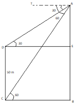 In the diagram, A represents the top of the tower, AB represents the height of the tower, DC represents the building of height 50 metres.