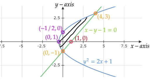 Equation of the curve is \[{y^2} = 2x + 1\;\] and the equation of line is \[x - y - 1 = 0\;\],
