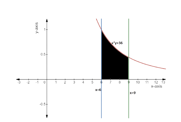 Therefore, the area of the bounded region will be the integration of the equation of the given curve in terms of $x$ i.e., $y = \dfrac{{36}}{{{x^2}}}$ with respect to $dx$ from $x = 6$ to $x = 9$.
