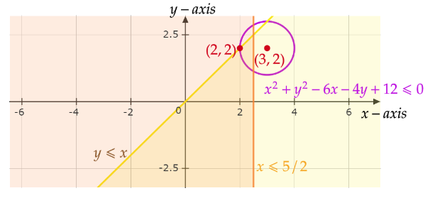 Also written as, ${\left( {x - 3} \right)^2} + {\left( {y - 2} \right)^2} \geqslant 1$