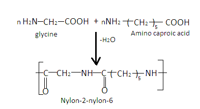 Step by Step Explanation: Nylon-$2$ -nylon-$6$ is a biodegradable polymer. It is a polyamide and is obtained by condensation of monomers glycine $\left( {{{\text{H}}_2}{\text{N - C}}{{\text{H}}_2}{\text{ - COOH}}} \right)$ and amino caproic acid $\left[ {{{\text{H}}_2}{\text{N}}{{\left( {{\text{C}}{{\text{H}}_2}} \right)}_5}{\text{COOH}}} \right]$ . When n numbers of glycine are condensed with n numbers of amino caproic acid, Nylon-$2$ -nylon-$6$ is obtained with the loss of water molecules. The reaction is as follows: