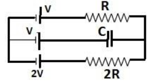 Hint Neglect the branch that has a capacitor attached with. Then, find the current in the remaining circuit. Then, select any one loop including the branch with capacitor and apply Kirchhoff’s Voltage Law.