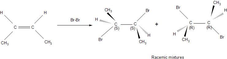 -This leads to the formation of a racemic mixture of $2,3-\text{dibromobutane}$, that is, the two forms being $(2R,3R)-2,3-\text{dibromobutane}$and $(2S,3S)-2,3-\text{dibromobutane}$.They are enantiomers.