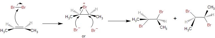 Note: It can be seen that the reaction is an anti-addition reaction and also stereospecific in nature. The carbon tetrachloride solvent only provides the opportunity for the reactant to get polarized and has no other effect on the reaction process.