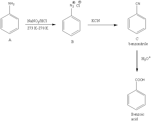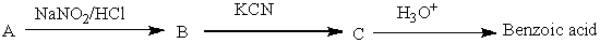 In the given question, the reactant A undergoes reaction with \[{\rm{NaN}}{{\rm{O}}_{\rm{2}}}/{\rm{HCl}}\] to form B. The then product formed B reacts with KCN to form C. The acidic hydrolysis of C results in the formation of benzoic acid.