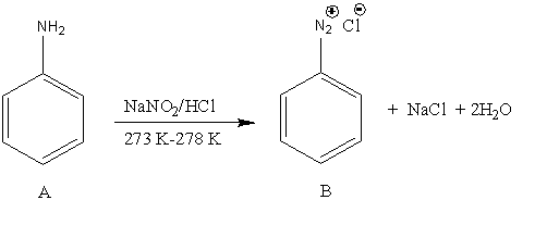 Let’s understand the diazotization reaction in detail. In the diazotization reaction, the primary aromatic amine converts into diazonium salt. Here, A undergoes undergoes reaction with \[{\rm{NaN}}{{\rm{O}}_{\rm{2}}}/{\rm{HCl}}\]. So, the reaction is,
