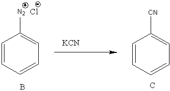 In the second reaction, B undergoes a reaction with KCN. The reaction of diazonium chloride with KCN results in the formation of cyanide. So, the reaction is,